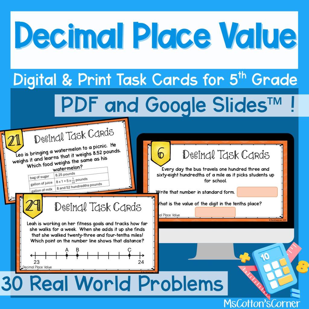 These Task Cards give students practice with the foundational concepts of Decimal Place Value. You get printable Task Cards in color AND B&W, and also two formats for Google Slides. That’s 30 different word problems in 4 different formats for 120 Task Cards!
